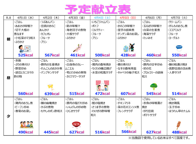 特養・ショートステイ 令和8年4月1日~15日の献立です。