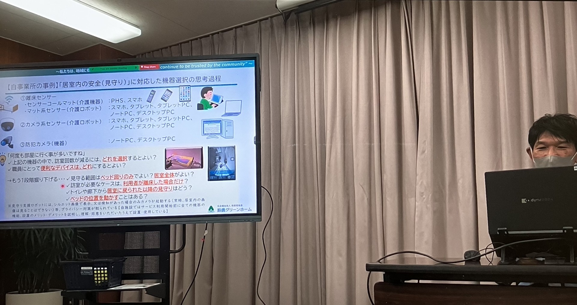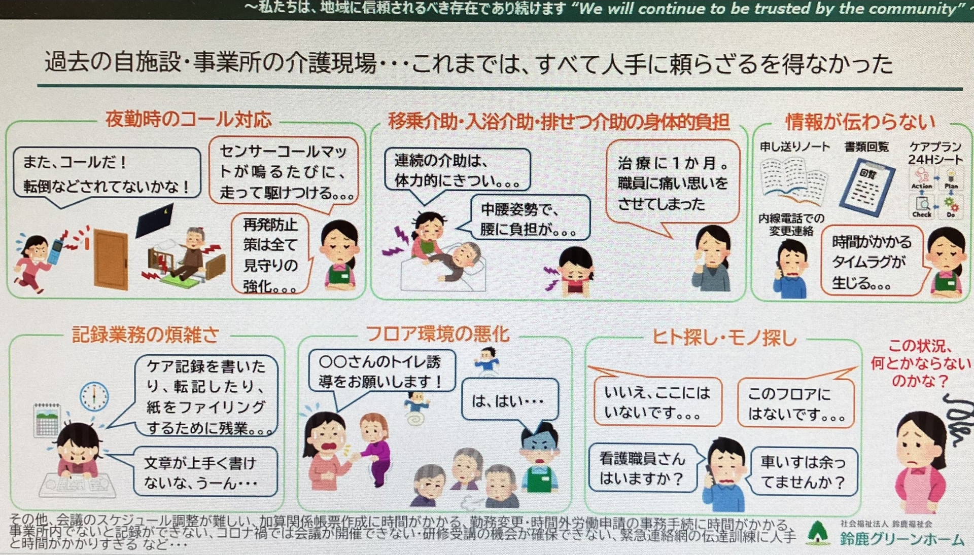 働き手の急減と後期高齢者の急増が予測されている中で、当ホームでは9年前から介護テクノロジーの取組を推進しており、介護ソフト・インカム・スマホなどICT(情報通信技術)機器や介護ロボットを試行錯誤を重ねながら活用してまいりました。