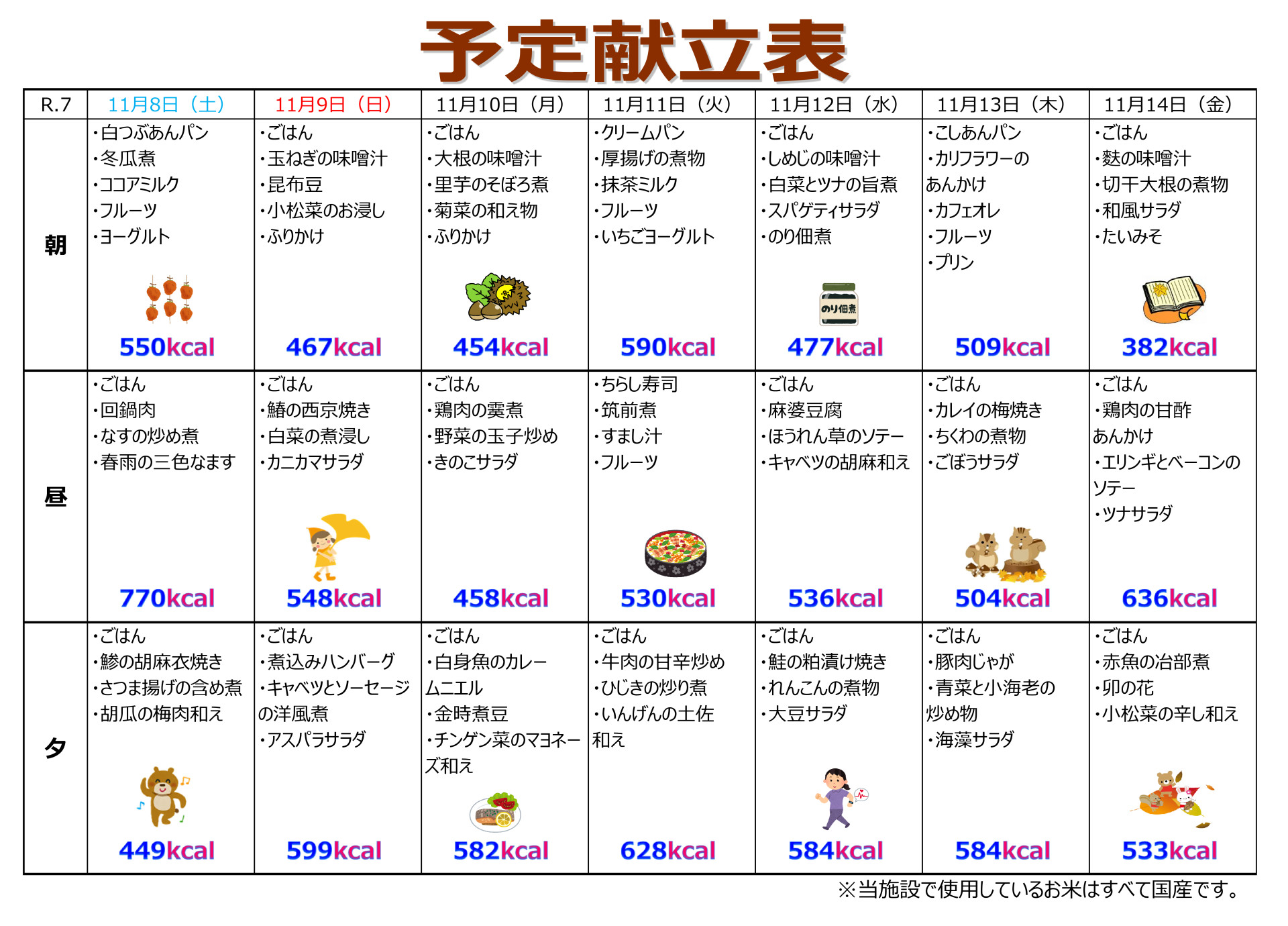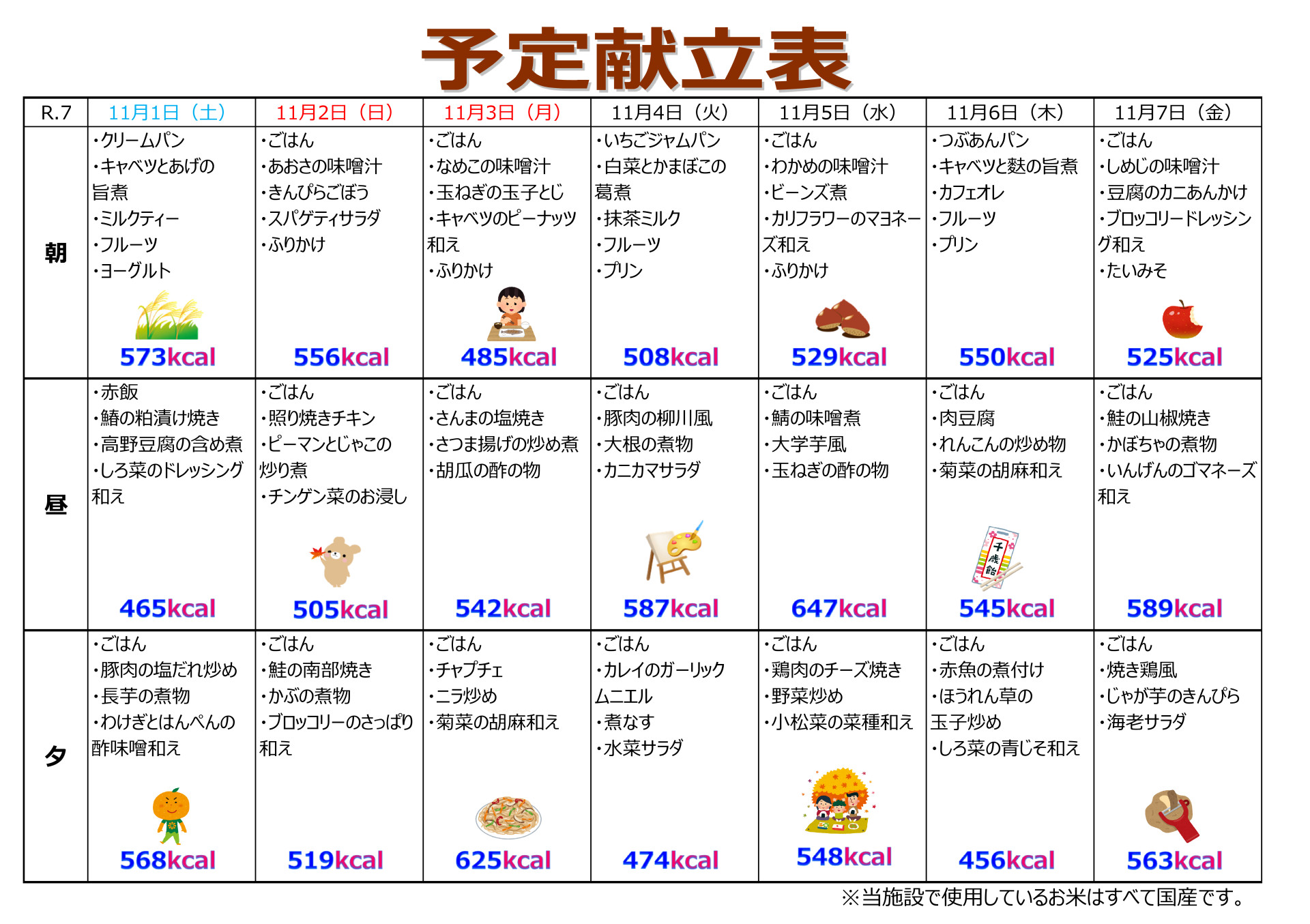 特養(特別養護老人ホーム) 特養・ショートステイ 令和7年11月1日~14日の献立 執筆者: 栄養士 日時: 2025/11/01 この記事に対して・・・ 1 人が「ええな~!」 と言っています。 #特養献立表 一覧へ戻る
