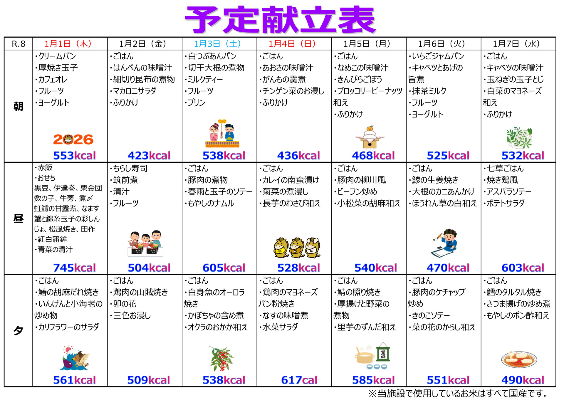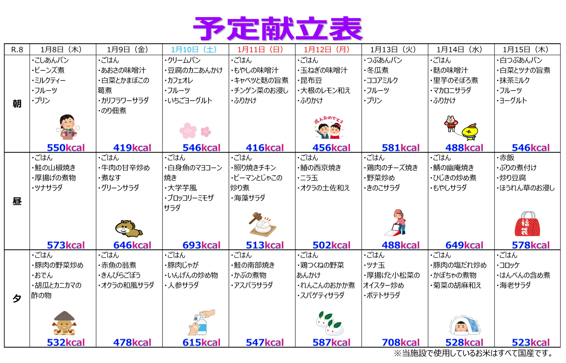 特養(特別養護老人ホーム) 特養・ショートステイ 令和8年1月1日~15日の献立です。 執筆者: 栄養士 日時: 2025/12/27 この記事に対して・・・ 1 人が「ええな~!」 と言っています。 #1月献立表 #R.8.1月献立表 #特養献立表 一覧へ戻る