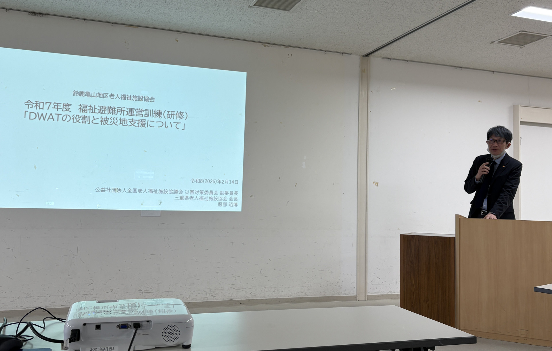 亀山市防災安全課職員様より、高齢者施設における災害対策について講演いただき、その後、私の方から全国老施協DWAT(災害支援福祉チーム)のお話をさせていただきました