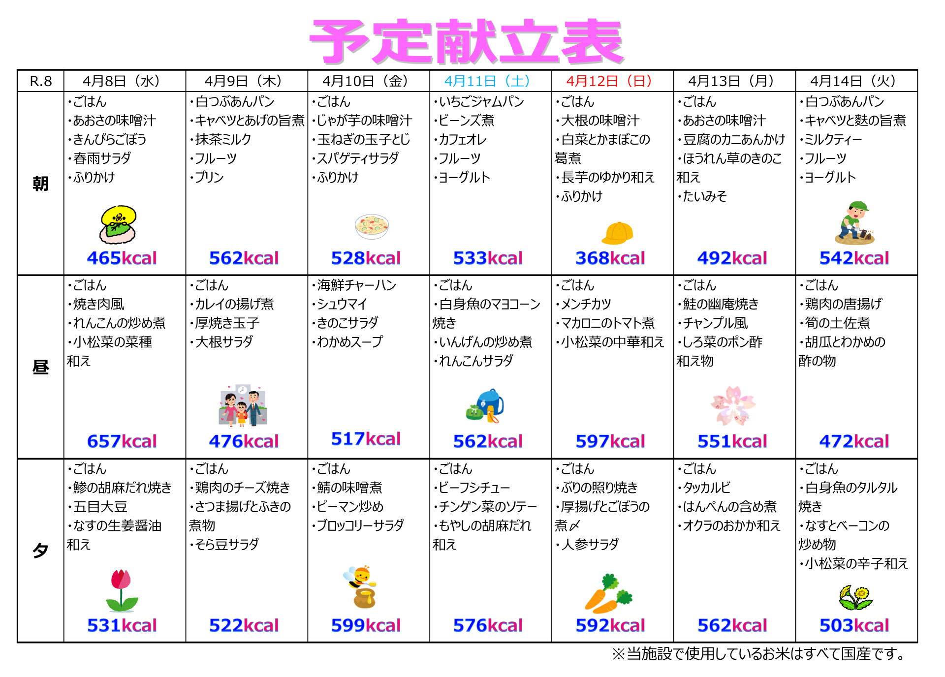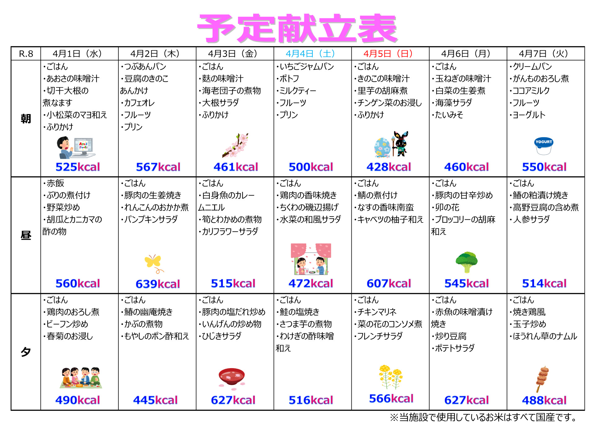 特養(特別養護老人ホーム) 特養・ショートステイ 令和8年4月1日~15日の献立です。 執筆者: 栄養士 日時: 2026/03/27 この記事に対して・・・ 0 人が「ええな~!」 と言っています。 #R.8.4月献立表 #特養献立表 #献立表 一覧へ戻る